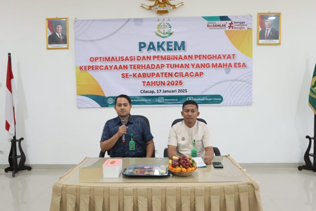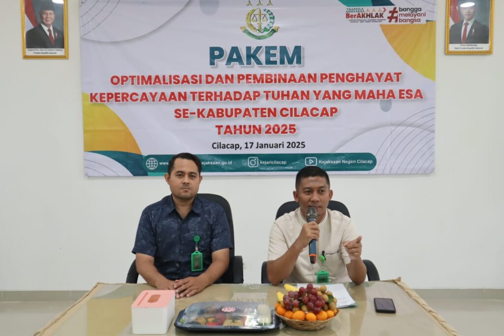 Pada hari Jumat, tanggal 17 Januari 2025, pukul 09.30 WIB hingga 11.00 WIB, telah dilaksanakan kegiatan Optimalisasi Pembinaan Penghayat Kepercayaan terhadap Tuhan Yang Maha Esa se-Kabupaten Cilacap tahun 2025. Acara ini bertempat di Aula Satya Adhi Wicaksana Kejaksaan Negeri Cilacap dan dihadiri oleh sekitar 50 orang.