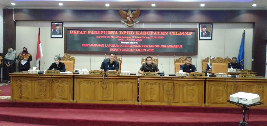 Senin tanggal 27 Maret 2023 bertempat di Ruang Rapat Paripurna DPRD Lantai II Jl. Jendral Sudirman No.52, Kel.Tegalreja, Kec. Cilacap Selatan, Kab. Cilacap telah dilaksanakan rapat paripurna DPRD Kabupaten Cilacap rapat ke-24 masa persidangan Il tahun sidang 2022-2023 dengan agenda rapat Penyampaian Laporan Keterangan Pertanggungjawaban (LKPJ) Bupati Cilacap Tahun 2022. Hadir dalam rapat tersebut 36 anggota dari 50 anggota dewan